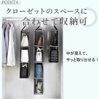 何か収納されているのか一目でわかる透明窓です。 さらに、横からカバンを出し入れできるため、使いたいバッグを すぐに見つけることができ、非常に便利です。そしてハンガータイプだから、引っ掛けるだけで簡単取り付け!