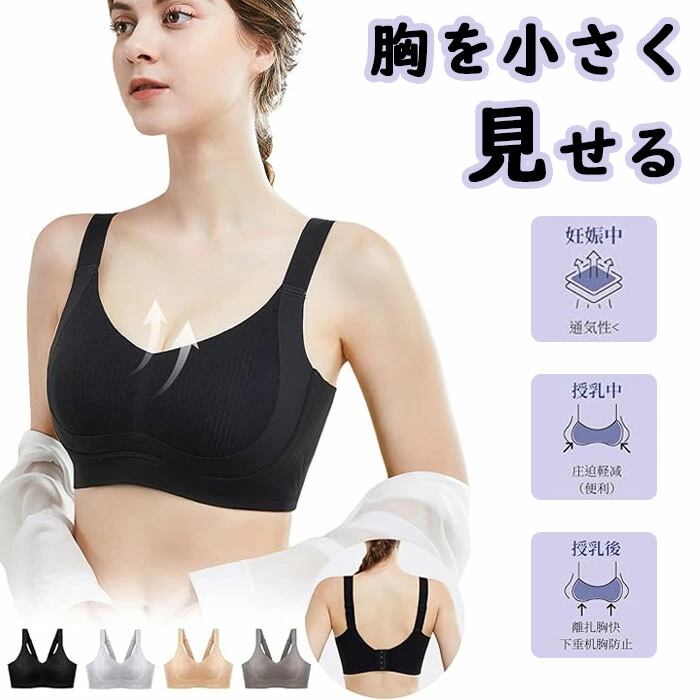 【女性バスト形態設計・美胸美背】シームレス小さく見せるブラが胸の段差による恥ずかしさを避けるだけでなく、トップ周径を効率的に減らす、着やせ効果のあるブラジャー。また、胸を小さく見せるブラサイドは脇肉集める仕様で脇肉がスッキリ!胸が小さく見せるブラ両サイト前にブラケット形状は、バストを真ん中に寄せ、横流れを防ぎ、Dカップでも激しい運動や寝るとき揺れない。更にバックは4列4バックルで調節可能、カップが歩かなくても安定感があります。<br><br>