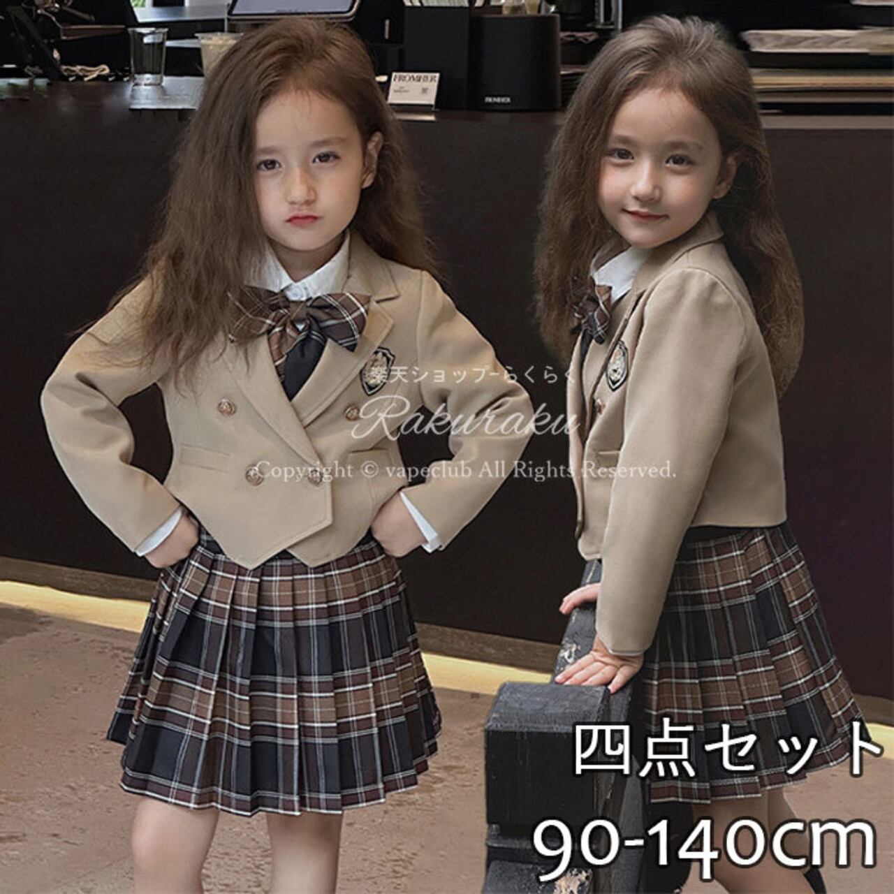 入学式 スーツ 女の子 4点セット 卒園式 スーツ 女の子 長袖 セットアップ フォーマルスーツ 卒業式 子供 ジャケット チェック柄スカート リボン 上下セット 小学生 卒園式 七五三 撮影 発表会 子供 フォーマル 90/100/110/120/130/140/150