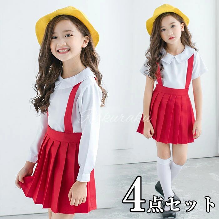 半袖/長袖4点セット:サスペンダースカート+トップス+帽子+ソックスの4点セット<br>